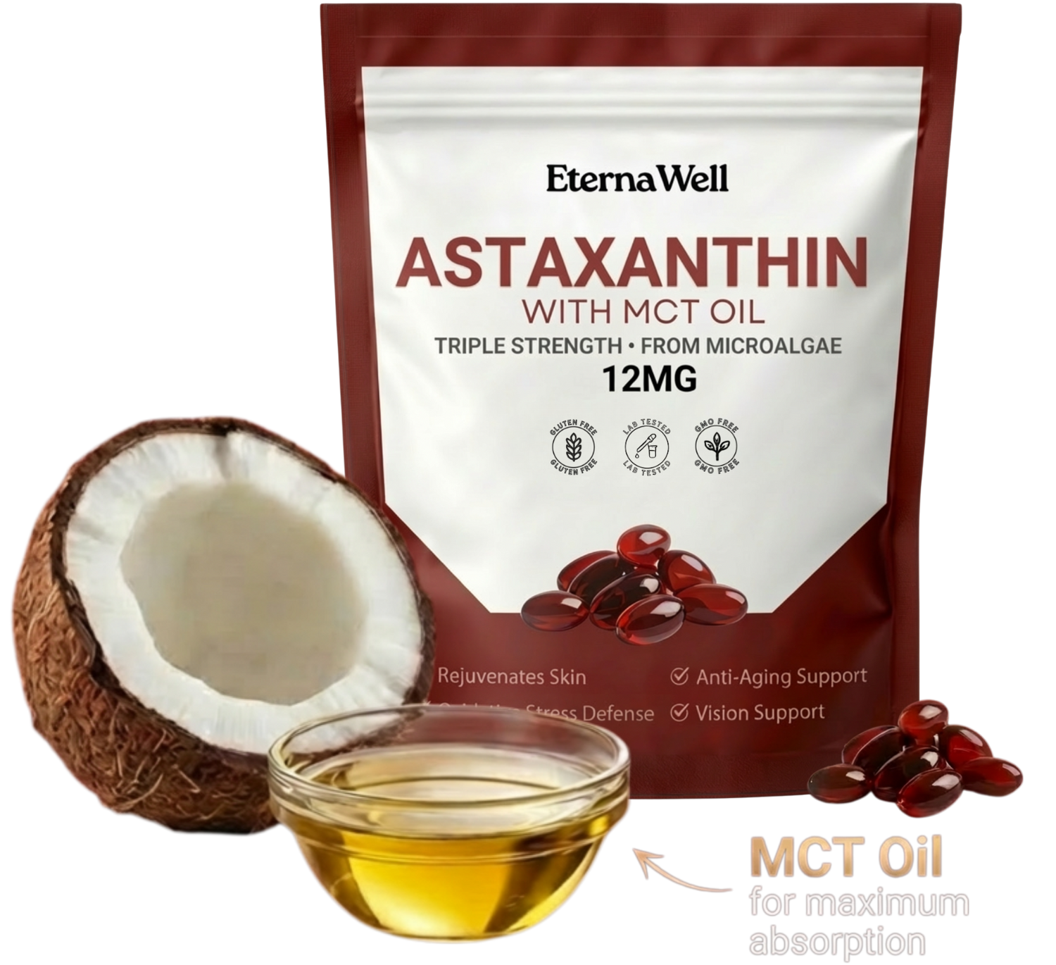 EternaWell is built differently. We suspend a full 12mg of astaxanthin in MCT oil, a high-quality fat that ensures your body actually absorbs what you're taking.
