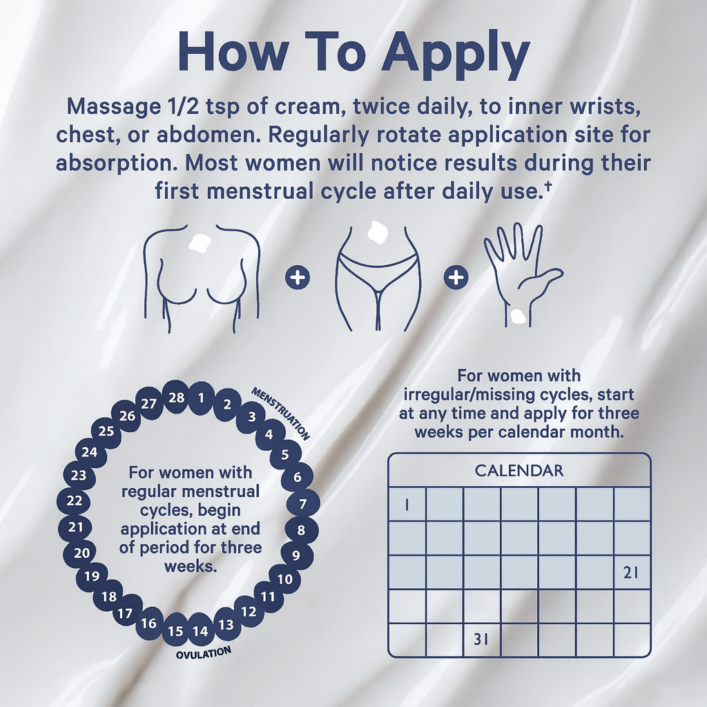 For women with irregular or missing cycles: Start any time and use daily for 3 weeks each calendar month, then pause for about 1 week. Rotate application sites with each use to support absorption.